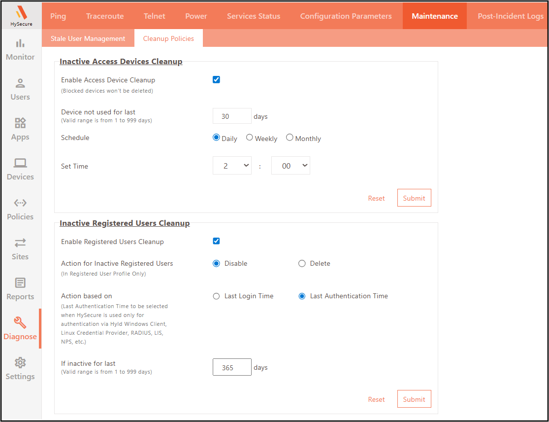 Navigate to Diagnose > Maintenance > Cleanup Policies.