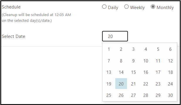 Monthly: Select this option to schedule Access Devices cleanup on a specific date each month. For example, in the image below, the cleanup is set to run on the 20th of every month.