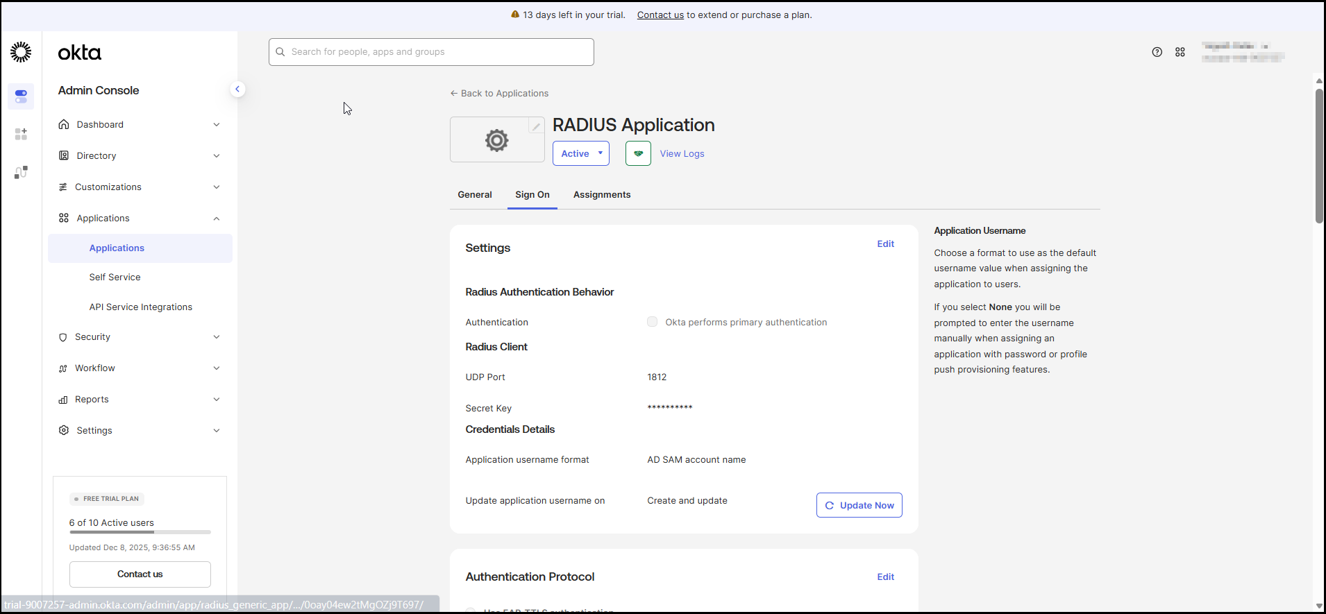 Field Example Authentication - Okta performs primary authentication Keep this option Unchecked UDP Port Enter 1812 Secret Key Enter the {secret-key} Under Credential Details > Application username format Select the AD SAM account name Under Credential Details > Update application username on Create and update