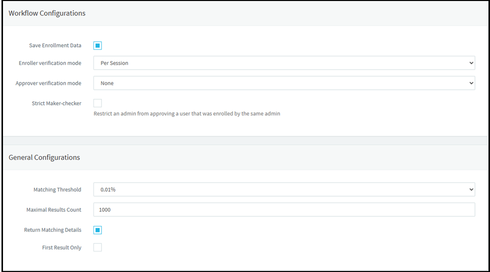 Per User: When configured, the mode will ask for biometric verification of the enroller or approver before capture or approval. This feature provides extra checkpoints in the system, as it facilitates the fact that only authorized users can allow various enrolment process steps or activities.