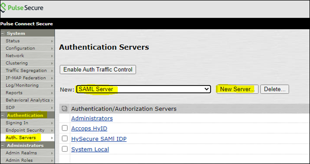 Navigate to Authentication > Auth Servers select SAML Server from the drop-down menu, and click New Server....