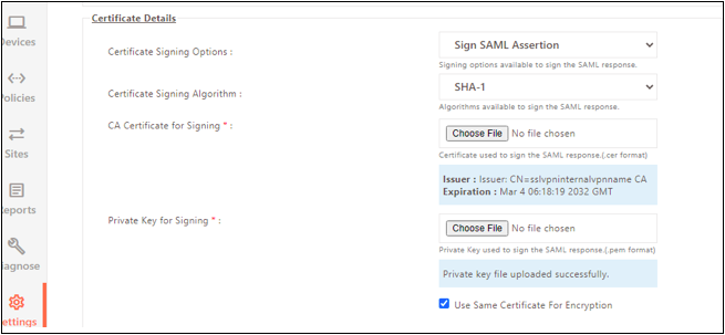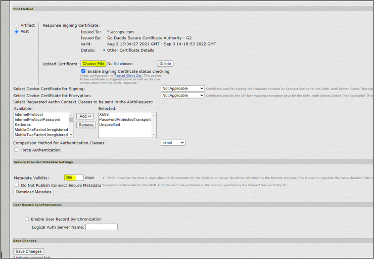 In the SSO Method section, upload the Certificate generated in the previous step and set the Metadata validity as 365 days. Save the settings.