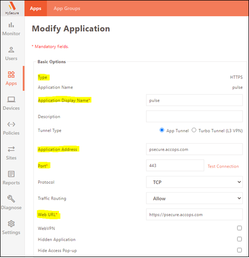 - Application Address: Enter the public DNS of the Pulse Secure gateway.