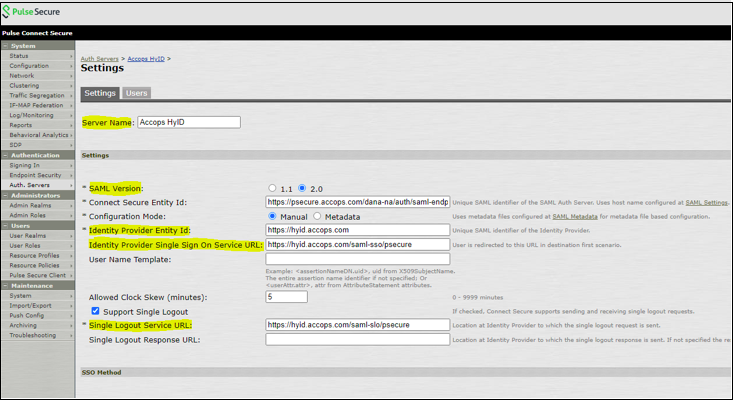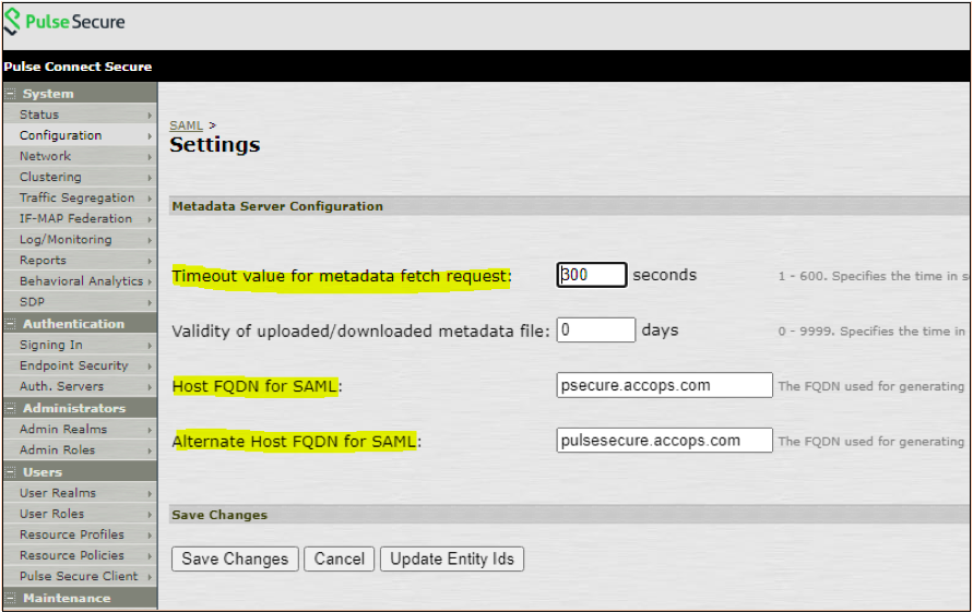 - Service Provider Entity ID: Enter the URL of the Service provider provided by the Pulse VPN team or from the Metadata generated in the Pulse VPN Portal.