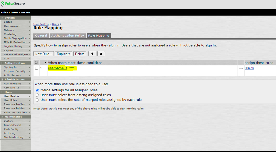 Navigate to User > User Realm > Users > Role mapping and create or modify a new role. For demonstration purposes, we have assigned all the users to log in.