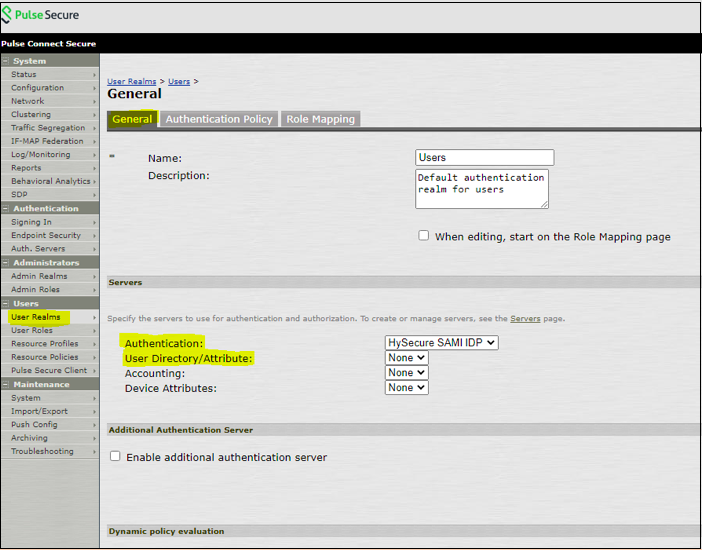 Navigate to User > User Realm > Users > General. Select the existing user realm and modify it as follows: