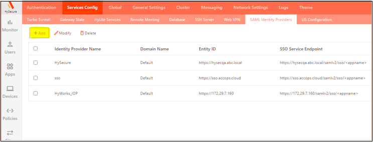 Navigate to Settings > Service Config > SAML Identity Provider and click Add to create a new Identity Provider.