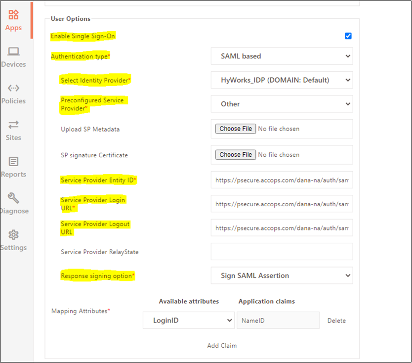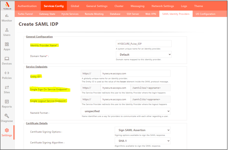 - Single Sign-On Service Endpoint: Enter the Public DNS or FQDN name of HySecure Gateway.