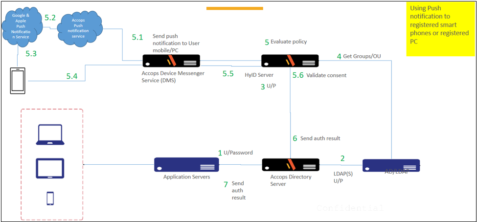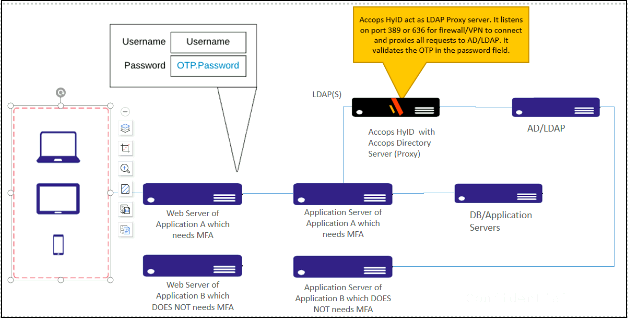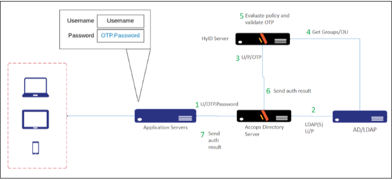 - When the credential reaches the Accops ADS server, the Accops HyID module will validate the OTP, and the username and password will be validated against Active Directory, since Accops ADS is already connected to the Active Directory/LDAP server and acting as a Proxy.