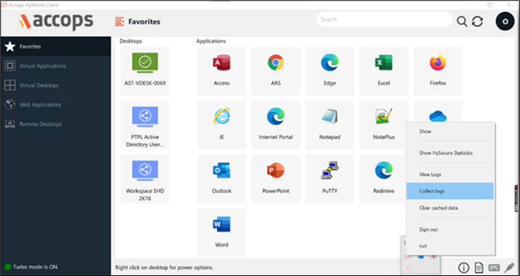 All functionalities will be the same as per the HySecure client. On HyWorks, client Turbo Status will be shown as Turbo is Not configured/Enabled or Turbo is Active.
