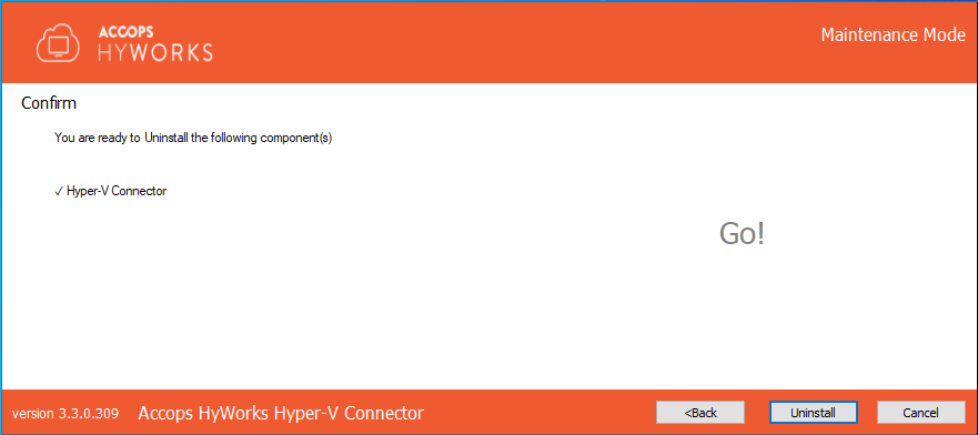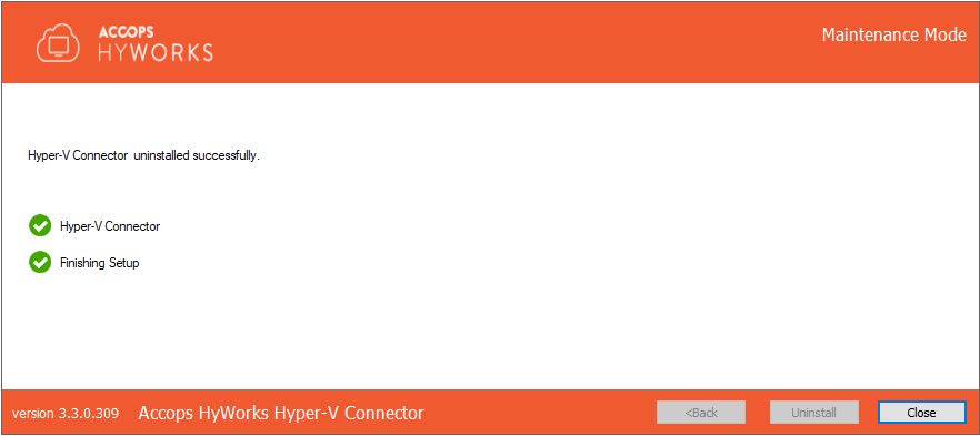Select Uninstall in the Maintenance window and click Next to uninstall the Hyper-V connector.