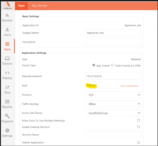 HySecure configuration to enable network port access: Details can be found here.