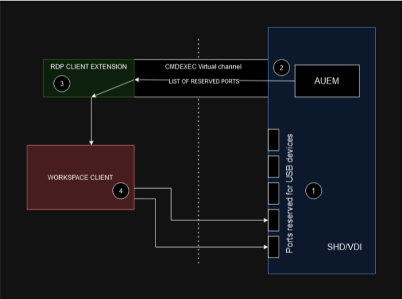 - Port Communication: The AUEM sends the list of reserved ports to the RDP client extension via the CMDEX virtual channel.
