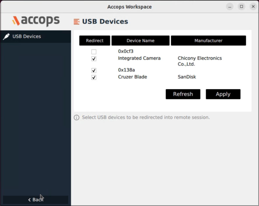 Choose the USB device you want to redirect and click Apply.