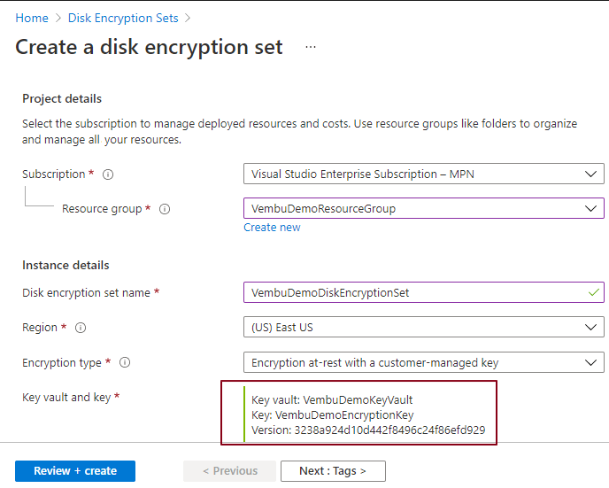 Provide a name for the new Azure subscription set and select the Azure region where you want to deploy this Azure Disk Encryption Set.