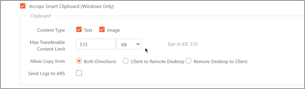 If both the Remote Session Default Clipboard and the Accops Smart Clipboard (Windows Only) are enabled, the Accops Smart Clipboard option takes priority and is used.