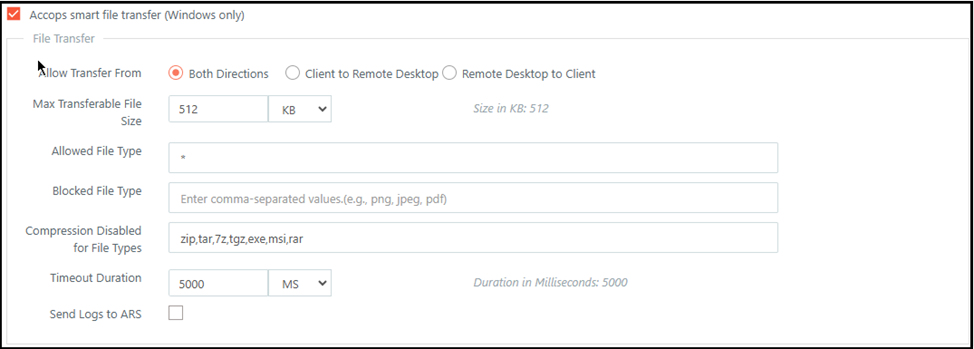 Send Logs to ARS: Enable/disable the checkbox to send the file audit logs to be sent to the Accops Reporting Server (ARS). This enables centralized log management to monitor and analyze file access and activities, enhancing security and compliance measures.