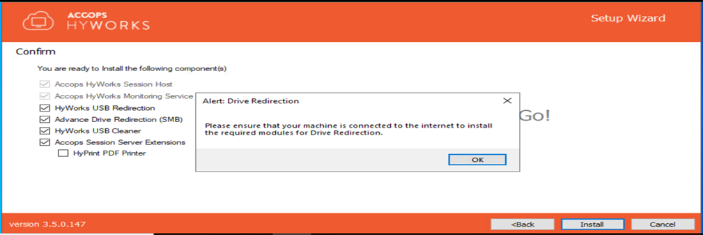 On selecting Advance Drive Redirection (SMB), a prompt will pop-up to confirm the internet availability on the server.