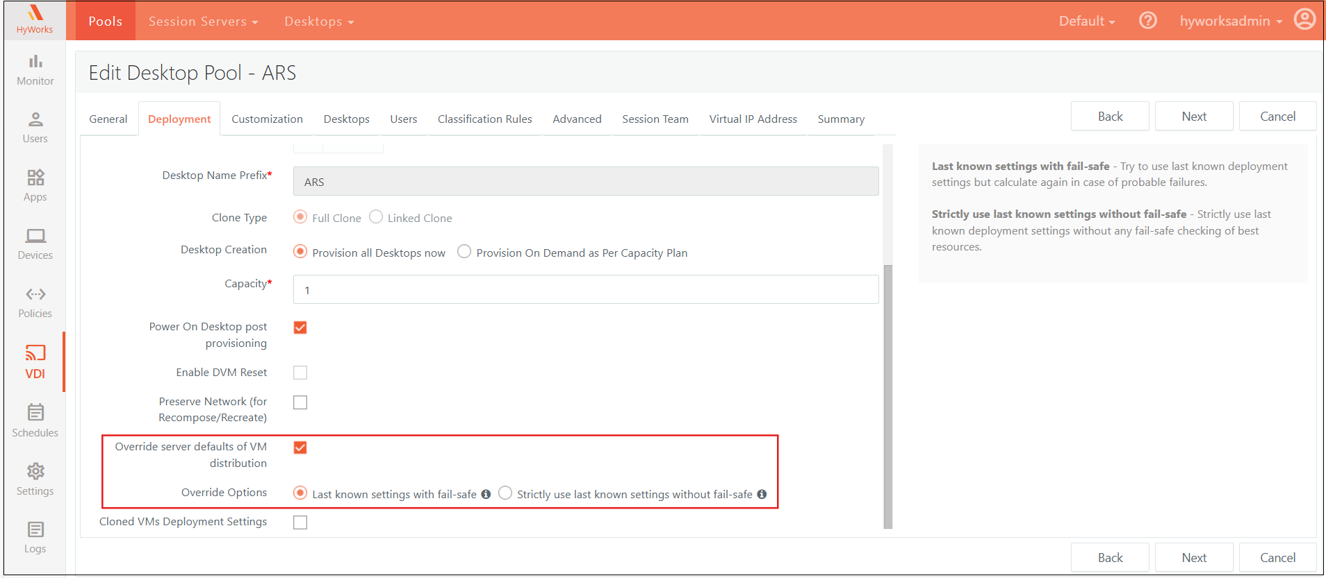 In the latest release of the HyWorks Controller, a new option has been introduced to provide administrators greater control over VM cloning and re-composition processes. The new Override Server Defaults of VM distribution feature offers two sub-options to handle the distribution of VMs when recomposing a desktop pool or re-creating a VM. This feature aims to improve flexibility and reduce the likelihood of deployment failures by allowing administrators to choose between a fail-safe approach or a strict adherence to previous settings.