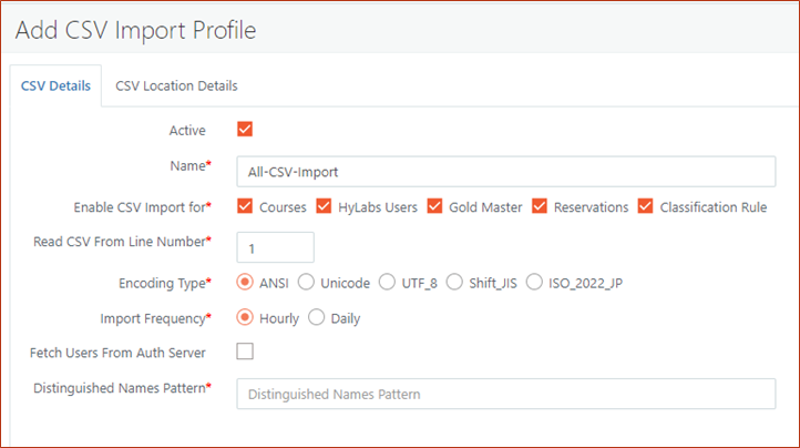 - Distinguished Name Pattern: Distinguished Name Pattern defines the distinguished name to be imported into HyLabs when processing CSV. An example of a correct DN pattern should be: CN={Display Name},OU=India,DC=accops,DC=local. e.g., user 'Rishi Gupta' is being imported from CSV, then in HyLabs its entry will be created as per the configured distinguished name pattern, i.e., CN=Rishi Gupta,OU=India,DC=accops,dc=local