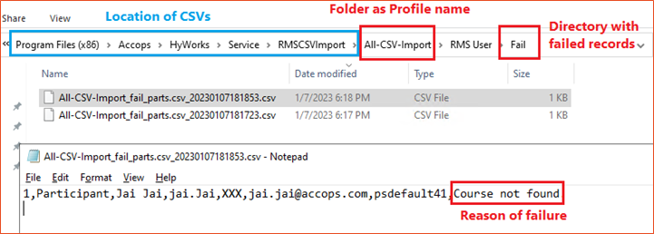 The processed CSVs are stored at the following location and contain details of failed entries, including the reasons for their failure.