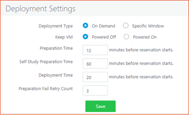 Self-study Preparation Time: Specific to self-study reservations. Self-study reservations will be prepared in given time. Being volatile in nature, Self-study Preparation Time should be kept high enough to allow (Cloning, Sysprep and Power Operation). Maximum value allowed in 180 mins.