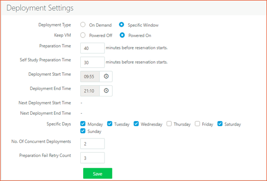 Self-study Preparation Time: Specific to self-study reservations. Self-study reservations will be prepared in given time. Being volatile in nature, Self-study Preparation Time should be kept high enough to allow Cloning, Sysprep and Power Operation. Maximum value allowed in 180 mins.