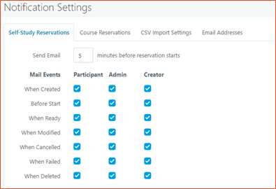 Self-study Reservations: Defining the self-study events on which e-mail notifications will be sent and what type of HyLabs users should receive notifications. The following events can be configured: