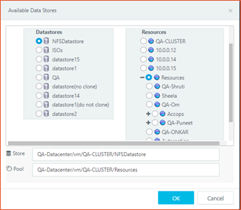 For VMware, all datastores, datastore clusters are listed on left hand side drop-down in appropriate tree architecture, whereas on right hand side expandable tree architecture of all resource pools, clusters, hosts will be shown. Administrator will be able to select any of resource pools and datastore.