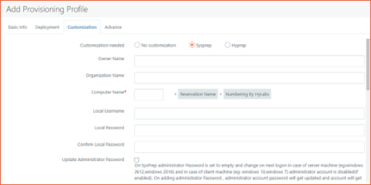 On selecting Sysprep or Hyprep as customization method, following fields will be enabled and can be configured for deployed VM customization: