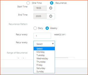 Select Recurrence Pattern as Weekly and provide numeric value from 1-52 for field Recur Every Week(s) (Recur every field along with selected Day will define the recurring schedule, e.g.,