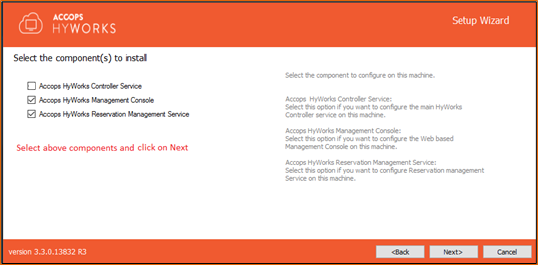 Select all HyWorks modules i.e., HyWorks Controller Service, Management Console and HyWorks Reservation Management Service as Components.