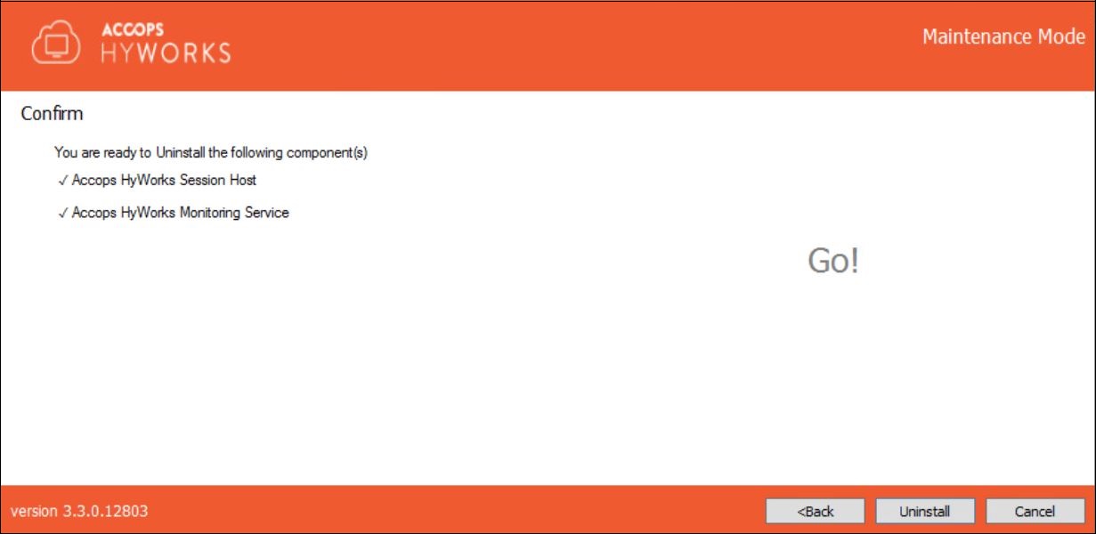 Click Uninstall to continue. This will remove all HyWorks Session Host Server modules from the system.