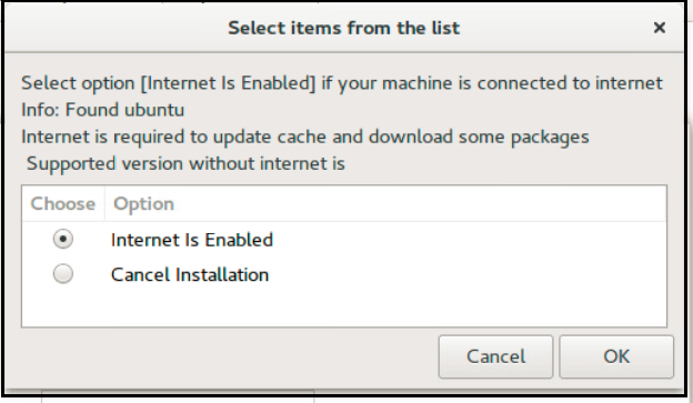 The installation script will verify if the available packages are enough for the base Ubuntu VM (Applicable for Ubuntu-based OS only). If additional packages are required, you will be prompted to confirm the Internet connection so that packages can be downloaded via the Internet. Click OK to proceed with the download.