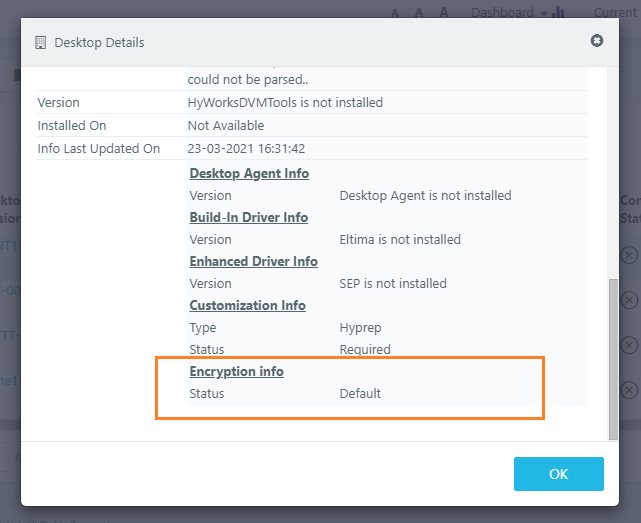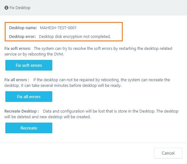 If deployed desktop is having disk encryption status as Failed or not required then, Fix desktop option will be shown with below information: