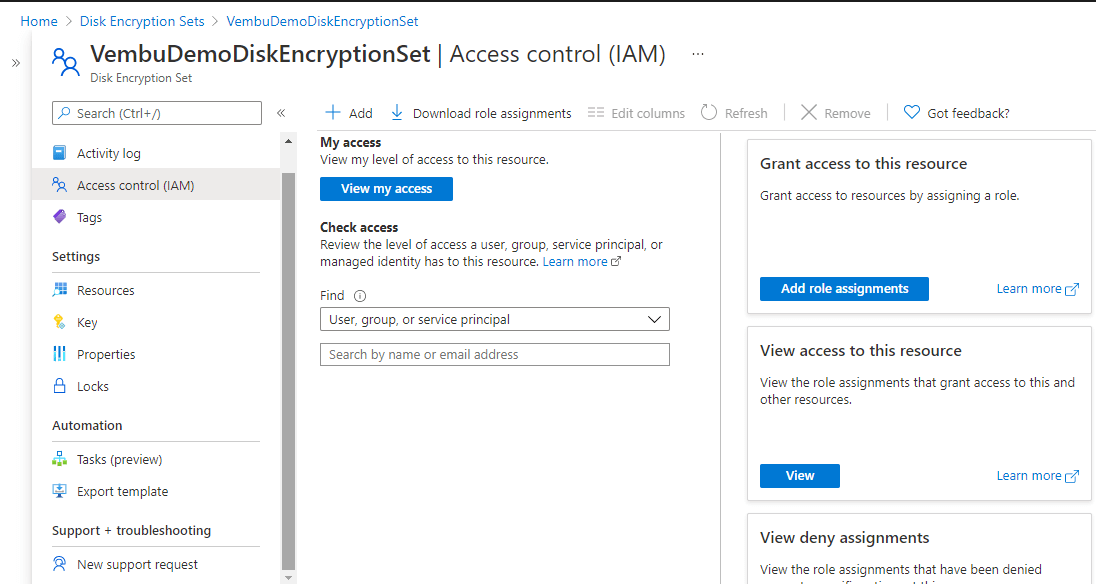 Access Control (IAM) for the disk encryption set resource: Check access, provide role assignments, add roles, adding deny assignments, etc.