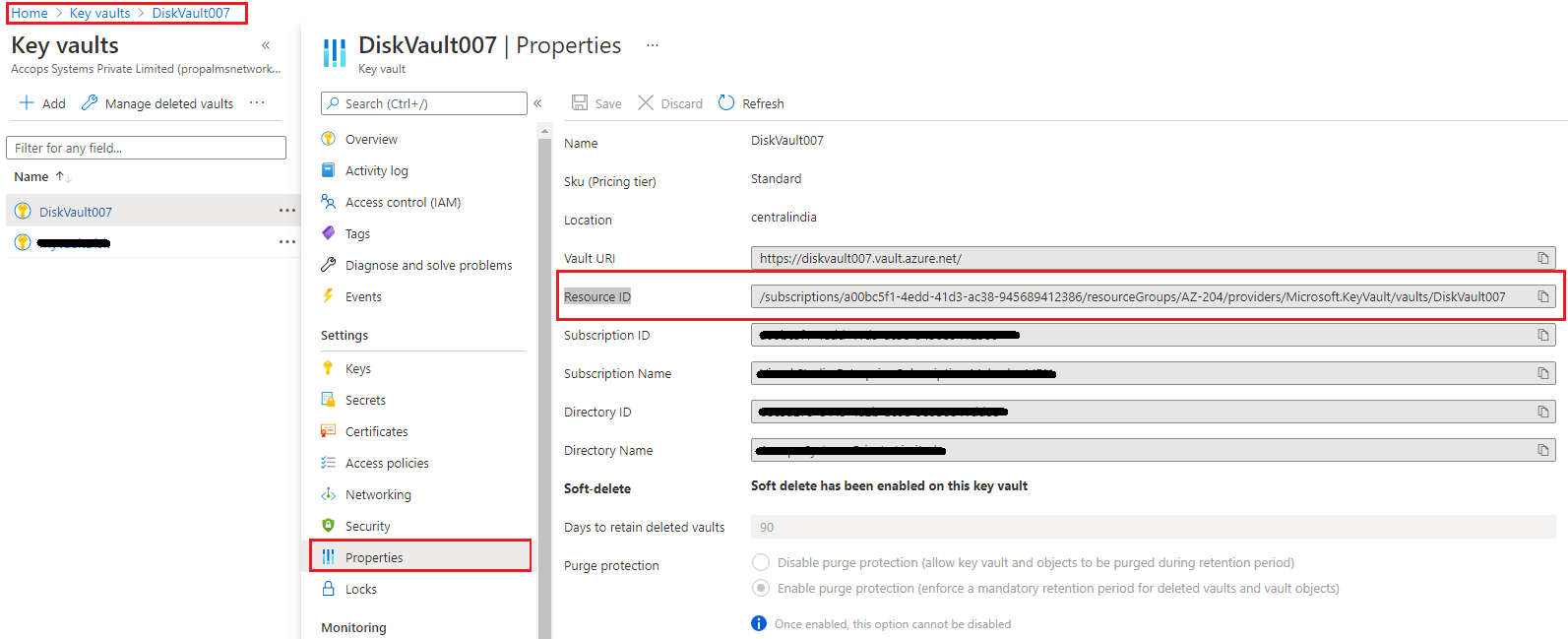 Days to retain deleted vaults – It can be configured for between 7 to 90 days. Once it has been set, it cannot be changed or removed.