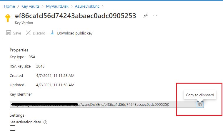 For this type of disk encryption, we need Azure Vault resource Id and Azure Key URL.