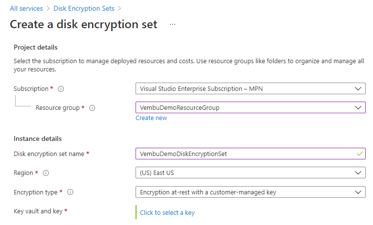 If you are using the Azure Disk Encryption set for the first time. You may need to create a new Azure key vault to store your keys before creating an Azure Disk Encryption set.