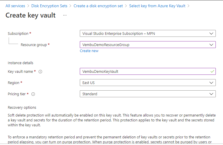 Recovery options – Soft delete protection will automatically be enabled on this key vault. This feature allows you to recover or permanently delete a key vault and secrets for the duration of the retention period. This protection applies to the key vault and the secrets stored within the key vault. To enforce a mandatory retention period and prevent the permanent deletion of key vaults or secrets before the retention period elapsing, you can turn on purge protection. When purge protection is enabled, secrets cannot be purged by users or by Microsoft.
