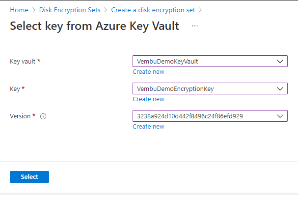Select the key vault and key to continue creating creating an Azure Disk Encryption set. Click Select to proceed further as shown below.