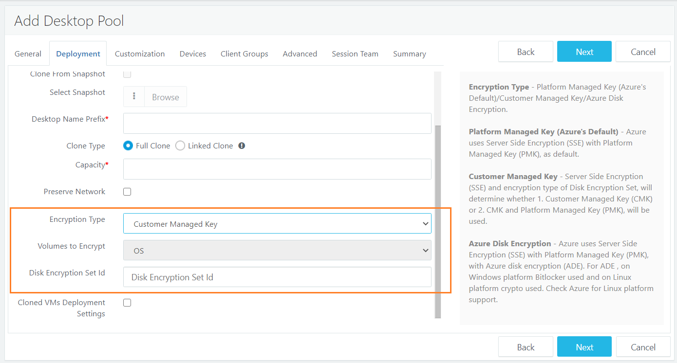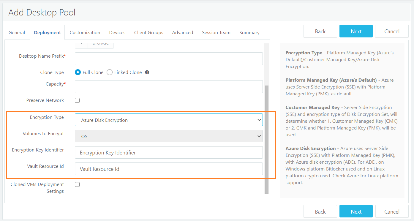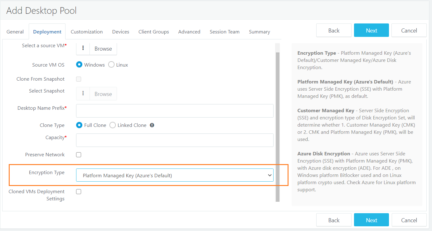 Process to enable Disk Encryption in HyWorks: Disk encryption can be enabled in Pool Add/Edit wizard and is applicable for Microsoft Azure only.