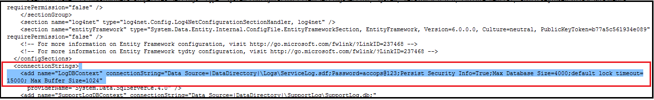 <add name="LogDBContext" connectionString="Data Source=<ServerAddress or FQDN>\sqlexpress<Instance name>,1433;Initial Catalog=LOGDB<Database name>;User ID=sa;Password=password@123;Encrypt=False;Min Pool Size=100;Max Pool Size=500;Pooling=true;TrustServerCertificate=False;MultipleActiveResultSets=true;" providerName="System.Data.SqlClient">