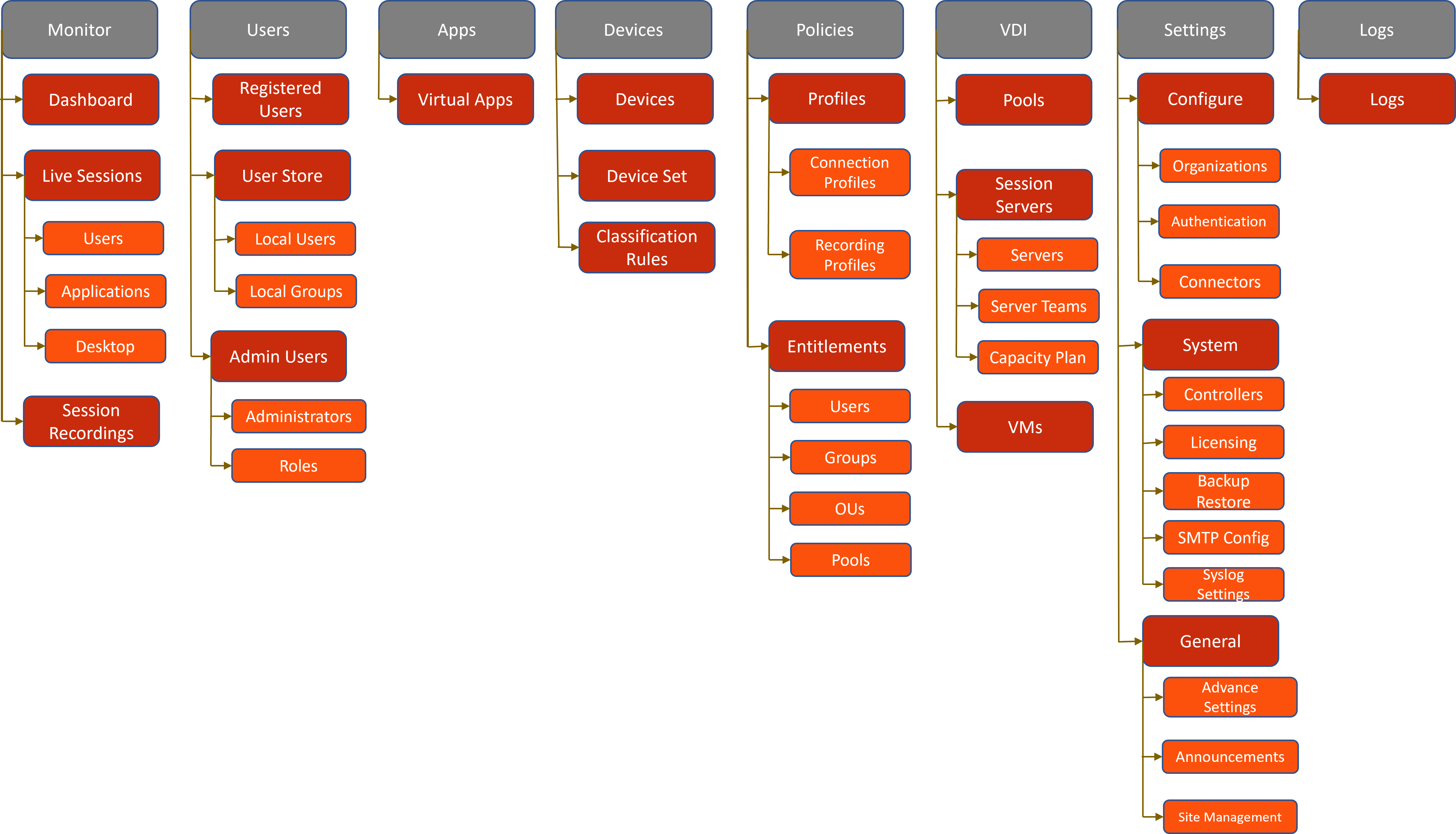 The VDI section allows management of desktop pools, session servers (session hosts, session teams, capacity planning), and desktop virtual machines.