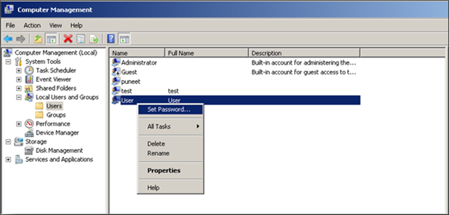 - Right click the user whose password needs to be resetted and select Set Password.