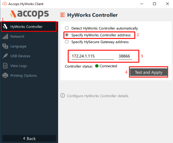 Select "HyWorks Controller" option from the left side pane, then specify the Controller IP address and port then click on "Test and Apply".