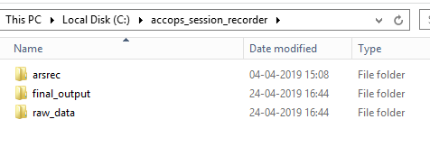 The files which are currently in raw_data folder are processed on disconnect and lock events of user and kept in final_output folder. By default the folder is not created. It will check if folder exists or no while placing the processed files. If it exists, it will skip the creation and when not present it will create the folder. Path of processed files folder:- C:\accops_session_recorder\final_output