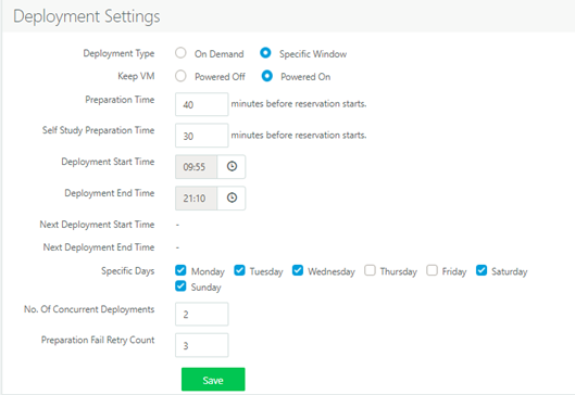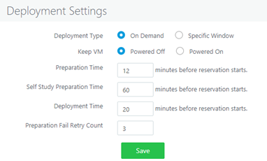 Self-study Preparation Time: Specific to self-study reservations. Self-study reservations will be prepared in given time. Being volatile in nature, Self-study Preparation Time should be kept high enough to allow Cloning, Sysprep and Power Operation. Maximum value allowed in 180 mins.