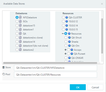 For VMware, all datastores, datastore clusters are listed on left hand side drop-down in appropriate tree architecture, whereas on right hand side expandable tree architecture of all resource pools, clusters, hosts will be shown. Administrator will be able to select any of resource pools and datastore.