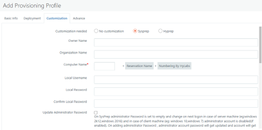 Update Administrator Password: Though it is enabled for both Hyprep and Sysprep but applied to Sysprep only. Where if the check box is not checked, the user “Administrator” in deployed VM will get reset and it will not be possible to access system using user “Administrator”. To avoid this, administrator password can be explicitly reset with Sysprep.
